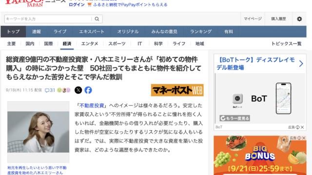 不動産投資家普段は金融の仕事をしながら2015年より不動産投資をはじめる。40歳で資産100億を目指し、物件の買い増しを続けている。